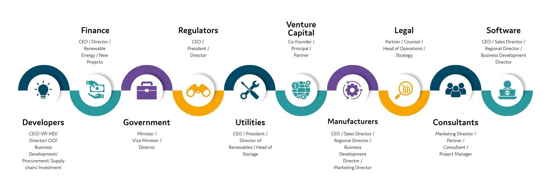 The Energy Storage Summit Middle East will include attendees from the following industries: renewables investors, BESS project developers, IPPs, policymakers technology innovators, grid operators, energy buyers, consultancies, from across the Middle East's energy storage ecosystem.